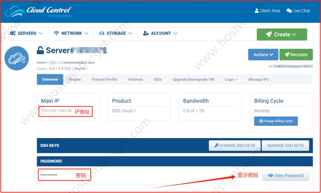 2、获取登录信息:在Hostwinds后台(或者查看订购时的邮件通知)获取服务器的IP地址、用户名和密码。